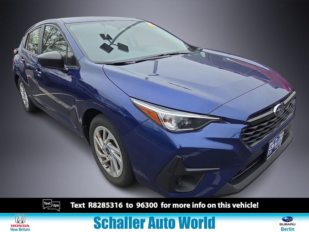 Sapphire Blue Pearl 2024 Subaru Impreza Base 2.0L DOHC CVT Lineartronic AWDOdometer is 10612 miles below market average! 27/34 City/Highway MPGSubaru Certified Pre-Owned Details: * Roadside Assistance * Warranty Deductible: $0 * SiriusXM 3-Month trial subscription $500 Owner Loyalty coupon & 1 year trial subscription to STARLINK * Vehicle History * 152 Point Inspection * Powertrain Limited Warranty: 84 Month/100000 Mile (whichever comes first) from original in-service date * Transferable WarrantySchaller Auto Group has TWO Used Car Locations: Right off Route 9 in New Britain and Route 9 and the Berlin Turnpike in Berlin. Please call 860-826-2023 to confirm this Vehicle's Location. All of our Pre-Owned Vehicles go through our Comprehensive 125 Point Quality Inspection. Every Schaller pre-owned vehicle comes with warranty coverage! With all budgets in mind we now offer Schaller “Value Cars” starting at $2995 and include a 30 day satisfaction guarantee and all come with a FREE Carfax Vehicle History Report. The Schaller Auto Group is Family Owned and Operated for Over 65 Years and is known for Selling Top Quality Used Vehicles and Standing behind them After the Sale!
