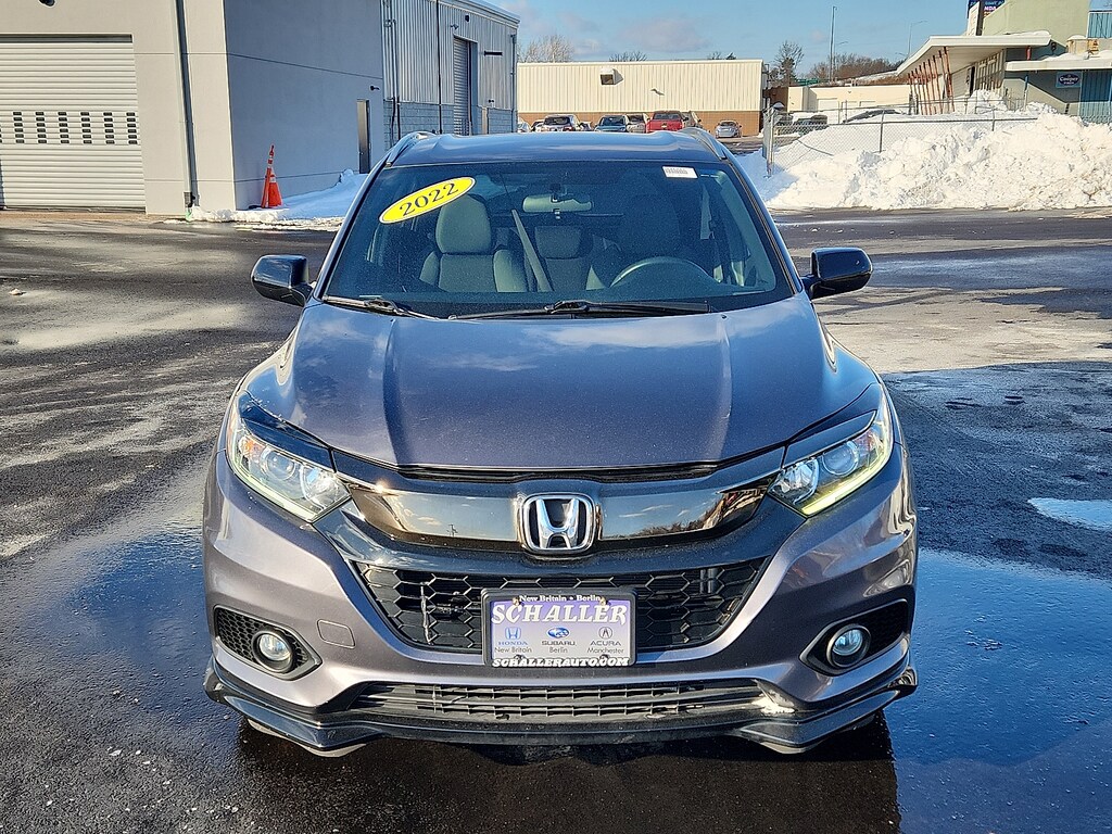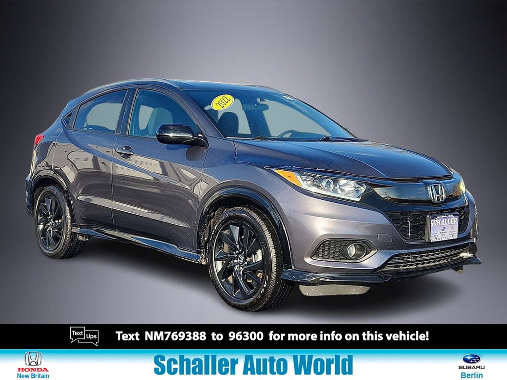 "2022 Honda HR-V Sport 1.8L I4 SOHC 16V i-VTEC CVT AWD4 Speakers 4-Wheel Disc Brakes 5.436 Axle Ratio ABS brakes Air Conditioning AM/FM radio Apple CarPlay/Android Auto Brake assist Bumpers: body-color Cloth Seat Trim Driver door bin Driver vanity mirror Dual front impact airbags Dual front side impact airbags Electronic Stability Control Emergency communication system: HondaLink Exterior Parking Camera Rear Front anti-roll bar Front Bucket Seats Front Center Armrest Front fog lights Front reading lights Front wheel independent suspension Fully automatic headlights Illuminated entry Low tire pressure warning Occupant sensing airbag Outside temperature display Overhead airbag Panic alarm Passenger door bin Passenger vanity mirror Power door mirrors Power steering Power windows Radio data system Radio: AM/FM Stereo Audio System (180-Watt) Rear anti-roll bar Rear window defroster Rear window wiper Remote keyless entry Roof rack: rails only Security system Speed control Speed-sensing steering Split folding rear seat Spoiler Steering wheel mounted audio controls Tachometer Telescoping steering wheel Tilt steering wheel Traction control Trip computer Wheels: 18""Matte-Black Alloy. Priced below KBB Fair Purchase Price! 26/31 City/Highway MPGSchaller Auto Group has TWO Used Car Locations: Right off Route 9 in New Britain and Route 9 and the Berlin Turnpike in Berlin. Please call 860-826-2023 to confirm this Vehicle's Location. All of our Pre-Owned Vehicles go through our Comprehensive 125 Point Quality Inspection. Every Schaller pre-owned vehicle comes with warranty coverage! With all budgets in mind we now offer Schaller âValue Carsâ starting at $2995 and include a 30 day satisfaction guarantee and all come with a FREE Carfax Vehicle History Report. The Schaller Auto Group is Family Owned and Operated for Over 65 Years and is known for Selling Top Quality Used Vehicles and Standing behind them After the Sale!"