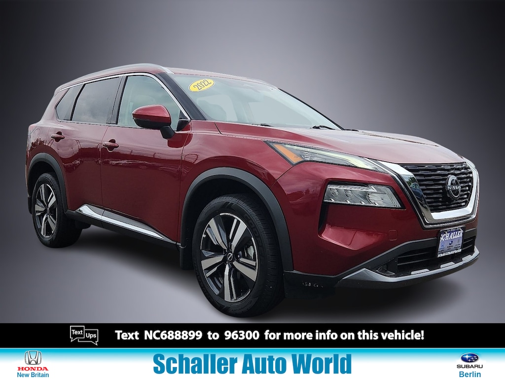 "Scarlet Ember Tintcoat 2022 Nissan Rogue SL 1.5L I3 Turbocharged DOHC 12V LEV3-ULEV50 201hp CVT with Xtronic AWD19""Aluminum Alloy Wheels 4-Wheel Disc Brakes 5.604 Axle Ratio 6 Speakers ABS brakes Air Conditioning Alloy wheels AM/FM Radio AM/FM radio: SiriusXM Auto High-beam Headlights Auto-dimming Rear-View mirror Automatic temperature control Black Splash Guards (Set of 4) Bose Premium Audio System Brake assist Bumpers: body-color Chrome Rear Bumper Protector Delay-off headlights Driver door bin Driver vanity mirror Dual front impact airbags Dual front side impact airbags Electronic Stability Control Emergency communication system: NissanConnect Services First Aid Kit Floor Mats w/2-Piece Cargo Area Protector Four wheel independent suspension Front anti-roll bar Front Bucket Seats Front Center Armrest Front dual zone A/C Front fog lights Front reading lights Fully automatic headlights Heated door mirrors Heated Front Bucket Seats Heated front seats Heated steering wheel Illuminated entry Knee airbag Leather-Appointed Seat Trim Low tire pressure warning Memory seat NissanConnect featuring Apple CarPlay and Android Auto Occupant sensing airbag Outside temperature display Overhead airbag Overhead console Panic alarm Passenger door bin Passenger vanity mirror Power door mirrors Power driver seat Power Liftgate Power moonroof Power passenger seat Power steering Power windows Radio data system Rear air conditioning Rear anti-roll bar Rear Parking Sensors Rear reading lights Rear seat center armrest Rear side impact airbag Rear window defroster Rear window wiper Remote keyless entry Retractable Cargo Cover Roof rack: rails only Security system Speed control Speed-Sensitive Wipers Split folding rear seat Spoiler Steering wheel mounted audio controls Tachometer Telescoping steering wheel Tilt steering wheel Traction control Trip computer Turn signal indicator mirrors Variably intermittent wipers. Priced below KBB Fair Purchase Price! Odometer is 18978 miles below market average! 28/34 City/Highway MPGSchaller Auto Group has TWO Used Car Locations: Right off Route 9 in New Britain and Route 9 and the Berlin Turnpike in Berlin. Please call 860-826-2023 to confirm this Vehicle's Location. All of our Pre-Owned Vehicles go through our Comprehensive 125 Point Quality Inspection. Every Schaller pre-owned vehicle comes with warranty coverage! With all budgets in mind we now offer Schaller âValue Carsâ starting at $2995 and include a 30 day satisfaction guarantee and all come with a FREE Carfax Vehicle History Report. The Schaller Auto Group is Family Owned and Operated for Over 65 Years and is known for Selling Top Quality Used Vehicles and Standing behind them After the Sale!"